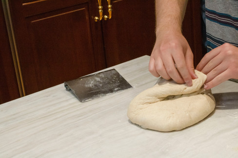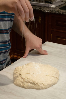 When the dough has been resting for 4 hours total, lightly flour the counter and turn the dough onto the countertop. Using your hands, form the dough into a taught ball (you should be able to touch the surface of the dough momentarily without it sticking to your finger). Cover with a dish towel and let rest for 30 minutes.