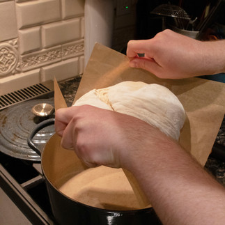45 minutes before baking, place a large dutch oven with the cover on in the center rack of the oven and heat to 500°F. Once the bread has rested, flip the loaf onto a sheet of parchment paper. Brush excess flour off the surface of the loaf, and with a bread lame or knife, score the loaf once around ¾” deep at a low angle. Remove the dutch oven from the oven, carefully place the loaf inside, and cover with the lid. Return to the oven, reduce oven temperature to 475°F, and bake for 20 minutes.